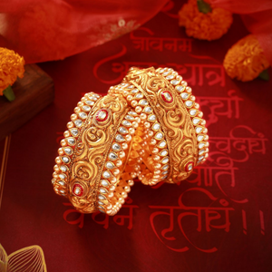 Our signature gold bangles with pearl accents bring a bridal glow to every wrist. Stack them for grandeur or wear solo for elegance — either way, they steal hearts.